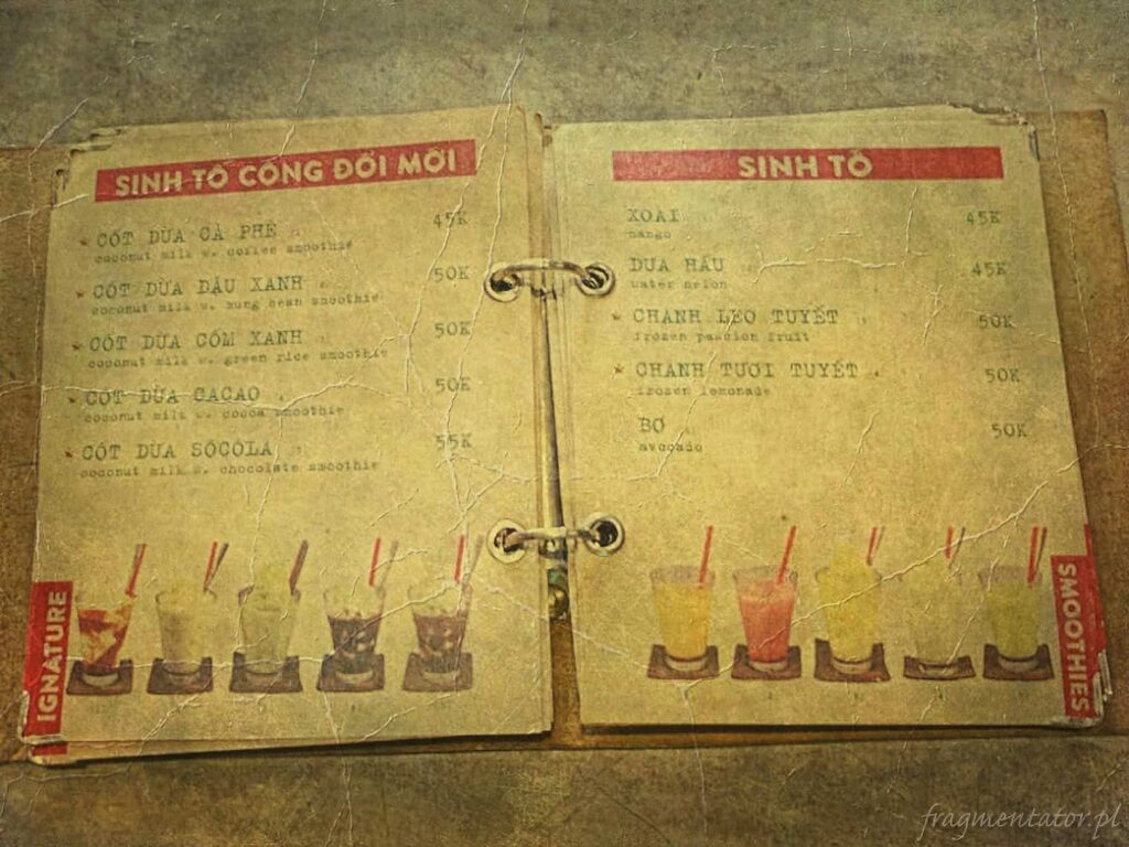 Kawiarnie Cong Caphe to przede wszystkim napoje na bazie kawy, w tym mój nr.1, czyli kawa z mrożonym jogurtem kokosowym – Cot Dua Ca Phe. Właściwie to bardziej deser niż kawa, ale oczywiście „czyste” kawy także są serwowane. Również drobne przekąski, piwa, jogurty oraz koktajle i napoje owocowe. Polecam z całego serca.