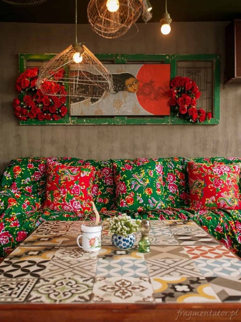 Obsługa ubrana jest w stroje inspirowane mundurami wojskowymi. Wnętrza kawiarni nie są duże, ale zazwyczaj zajmują kilka kondygnacji. Wypełnione są drewnianymi meblami, kwiecistymi materiałami oraz najróżniejszymi pamiątkami w postaci min. starych zdjęć, plakatów, książek i elementów wojskowych.