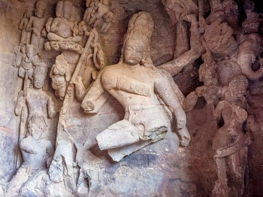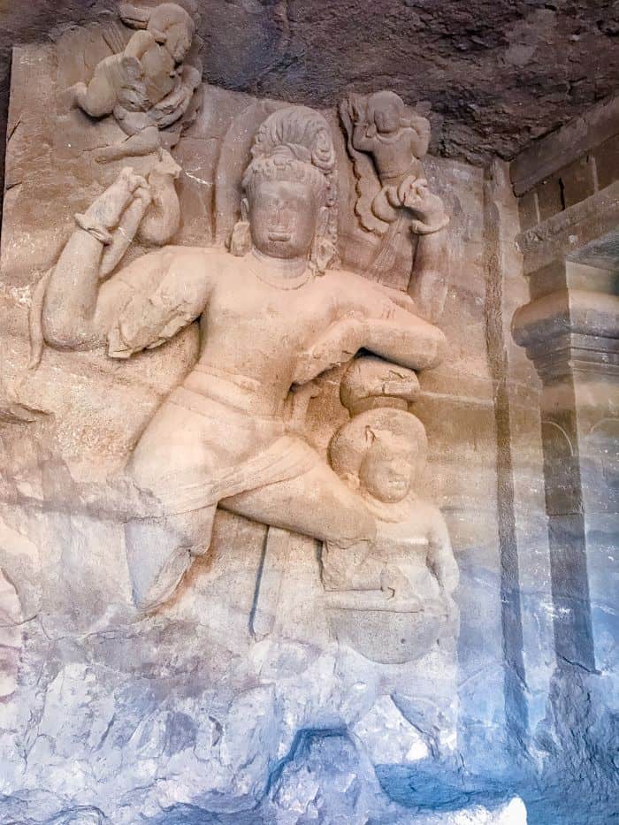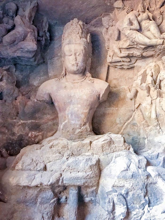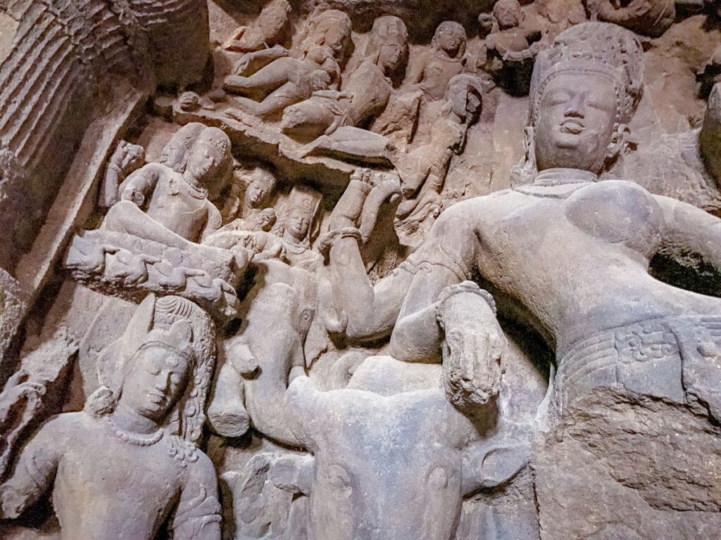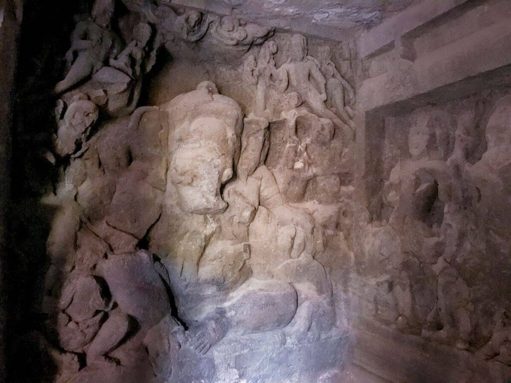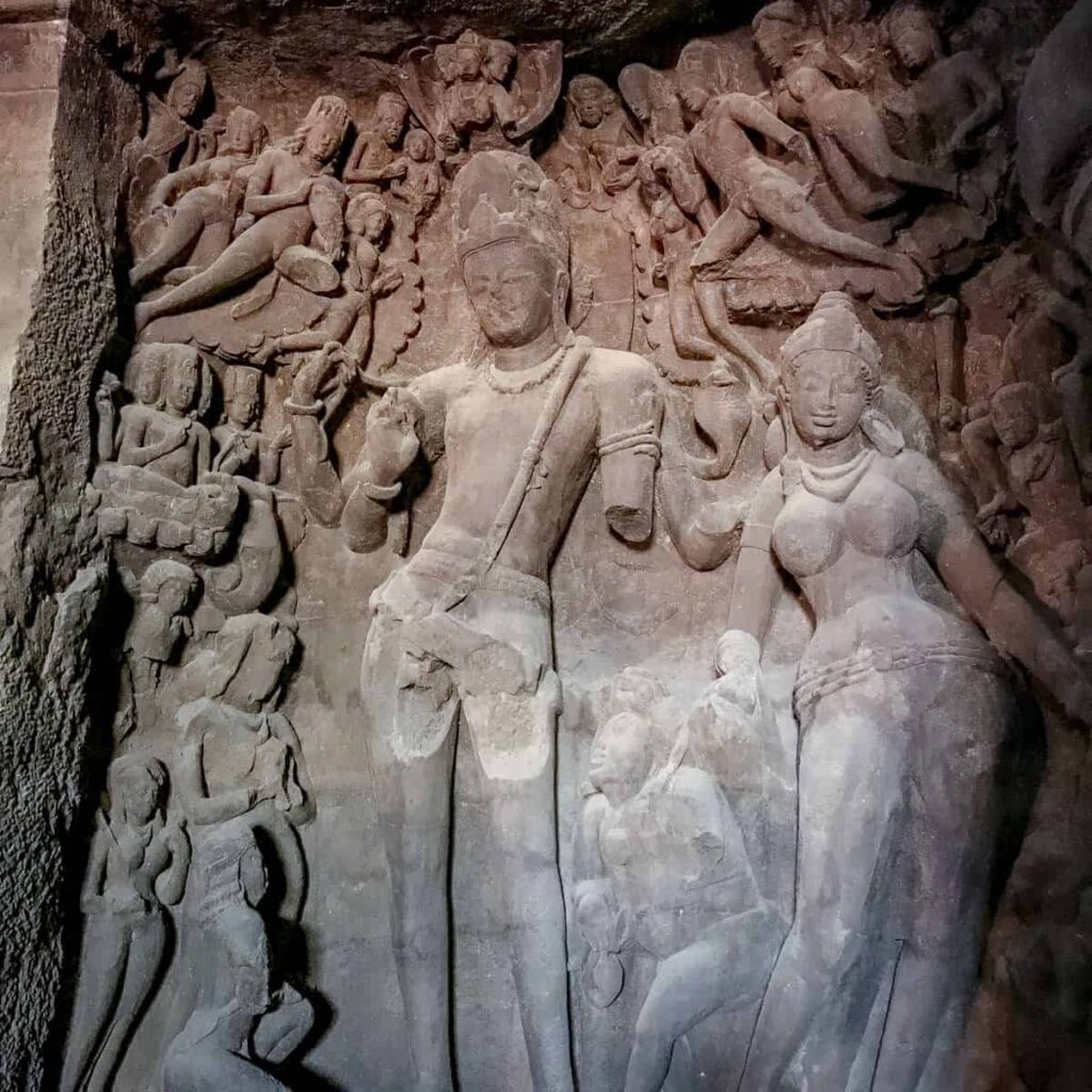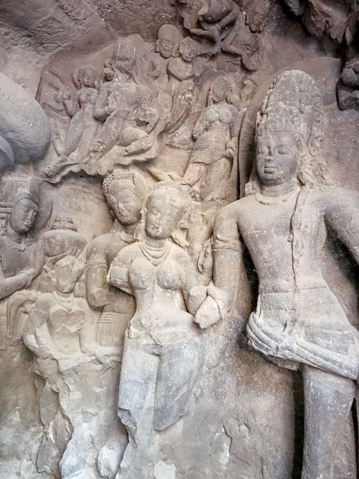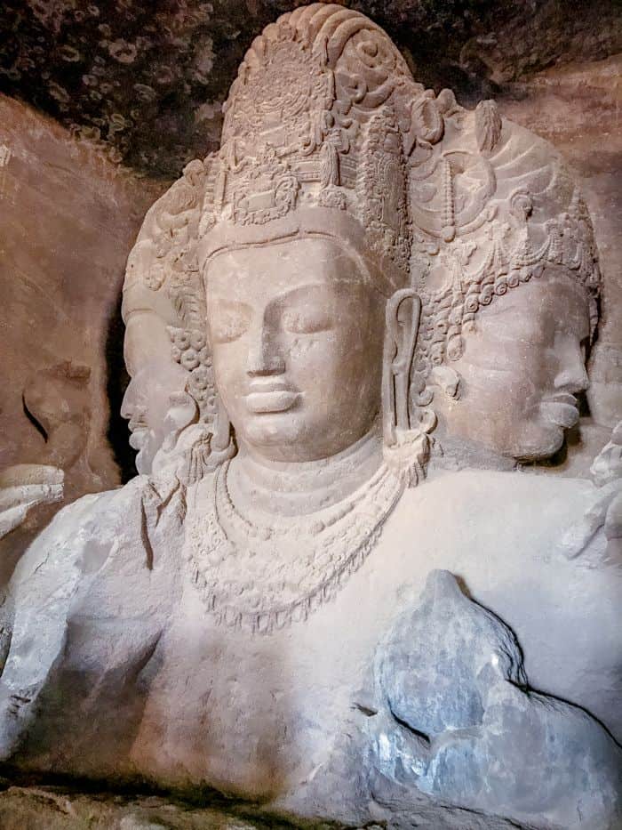 Sześciometrowe popiersie trójgłowego Śiwy ukazuje trzy wcielenia: po prawej stronie Brahma jako stwórca, twarz w koronie w środku to Wisznu jako obrońca, po lewej stronie Shiva jako niszczyciel. Wśród postaci na ścianach groty można odnaleźć m.in.: Pana Tańca (Nataraja) i Pana Jogi (Yogishvara).