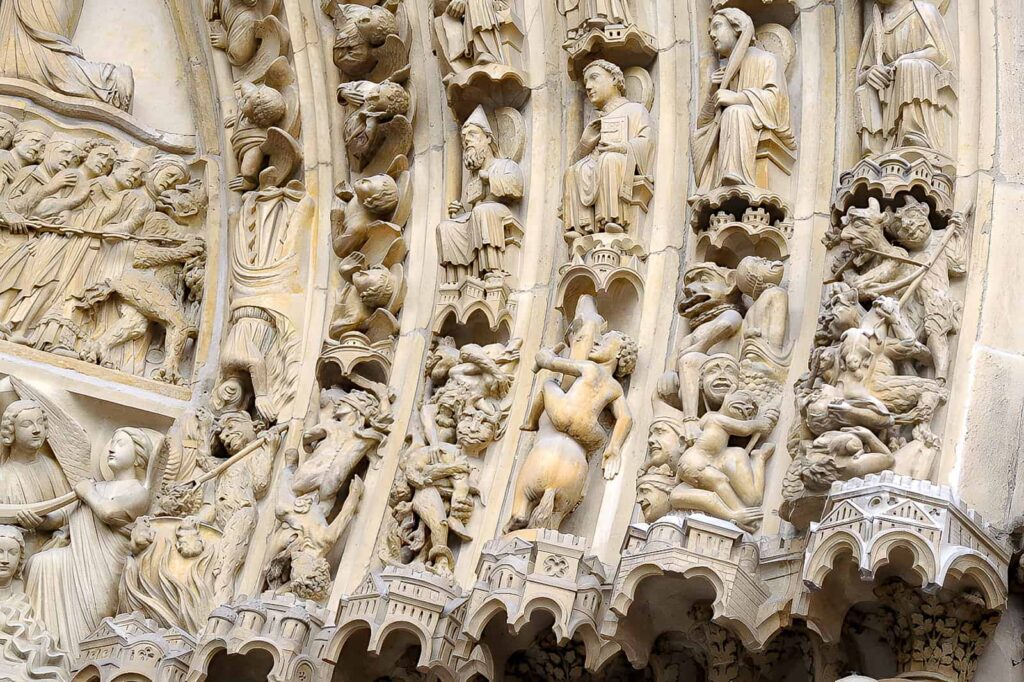 - Trzy portale ze wspaniałymi rzeźbami, od lewej: Portal Matki Boskiej, Portal Sądu Ostatecznego (centralny), Portal św. Anny,