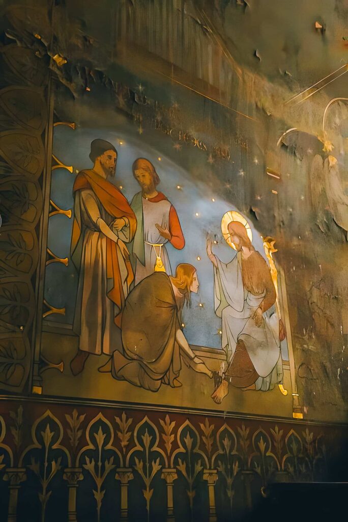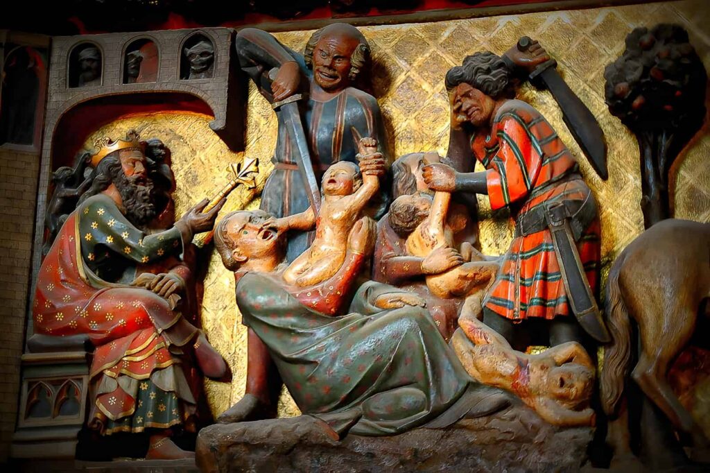 - Przegroda prezbiterium – XIV-wieczna, wysoka kamienna przegroda dekorowana polichromowanymi płaskorzeźbami,