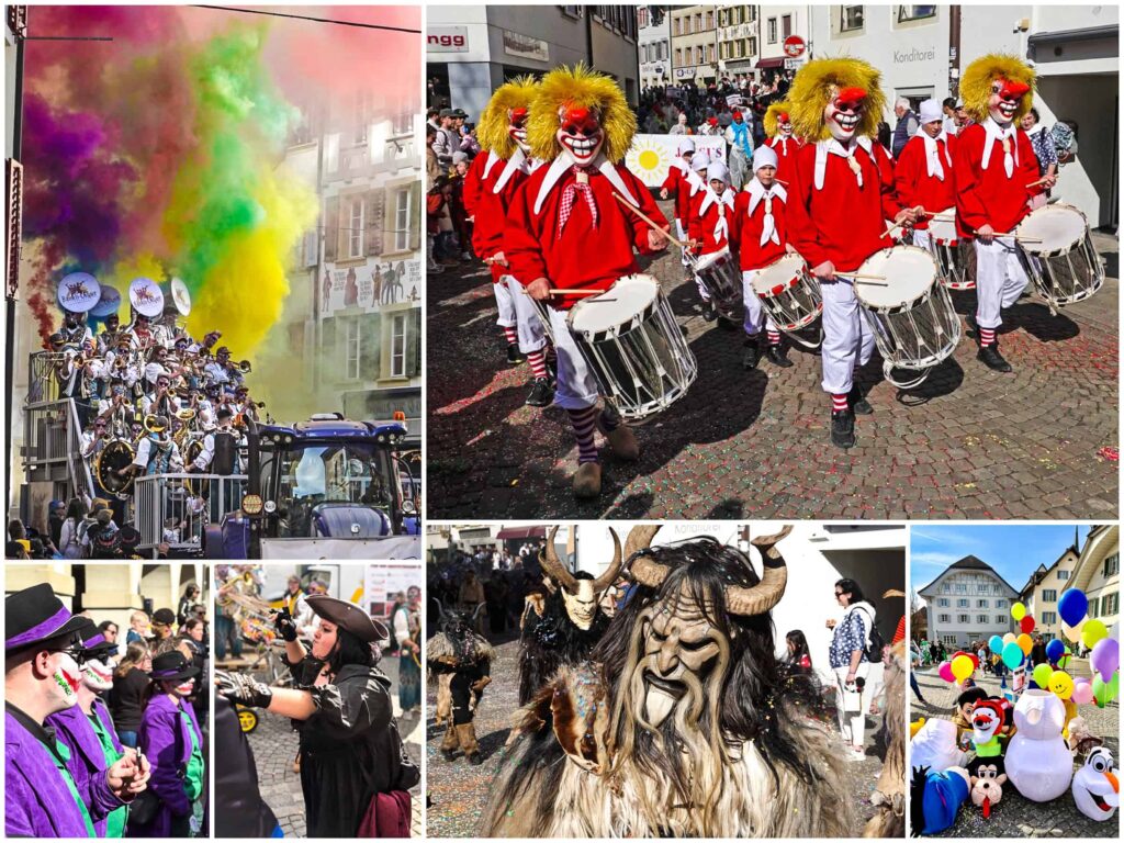 Na początku marca oglądaliśmy Fasnachtsumzug w Zofingen. Muszę przyznać, że widok przebierańców maszerujących wśród tłumu wiosennie ubranych ludzi był surrealistycznym doświadczeniem. Nie wiem, jak w takim słońcu dali radę w tych strojach i maskach.