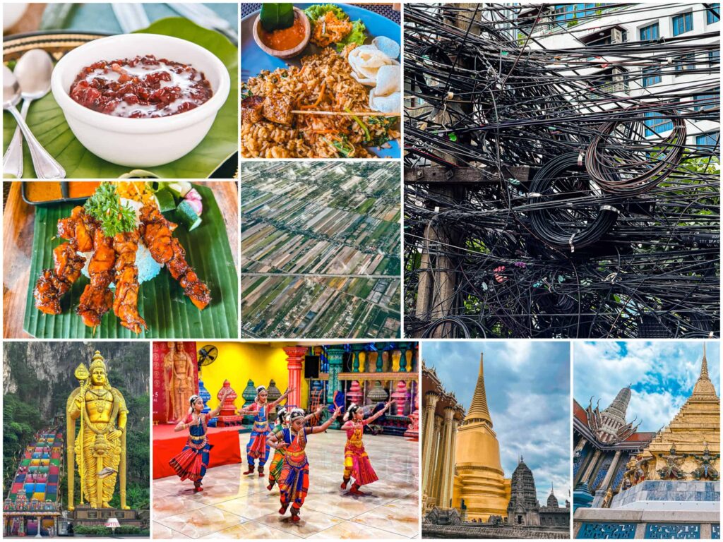 Najpięknieszy widok: Trudno o jeden, ale na podium umieszczę: Batu Caves (za kolory i przyjaznych ludzi), Wat Phra Kaew (za wręcz psychodeliczne nagromadzenie w jednym miejscu kształtów, struktur i barw), geometryczna mozaika tajskich pól widziana z okna samolotu (bo nigdzie jeszcze nie widziałam tak pod linijkę wyznaczonych poletek). W bonusie – plątanina kabli na ulicach Bangkoku (bo podobno ten niewyobrażalny chaos, jest chaosem kontrolowanym).