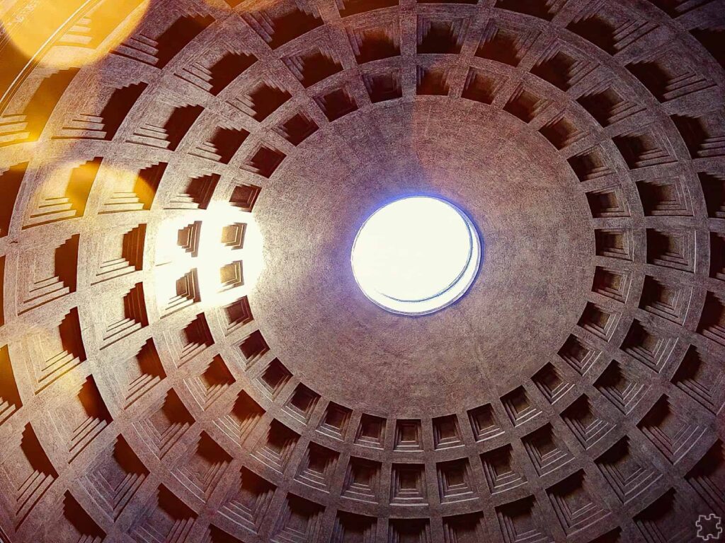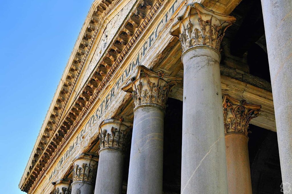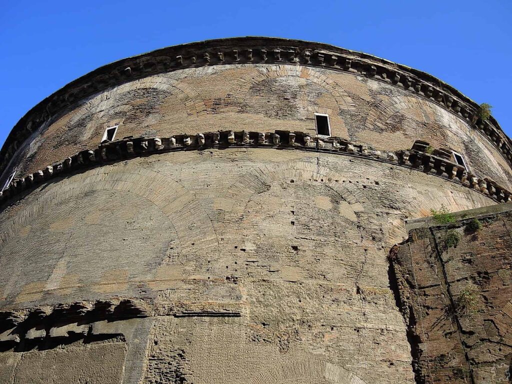 Panteon wzniesiono w latach 118-125 n.e. To najlepiej zachowany antyczny zabytek w Rzymie. Uważany jest za doskonały przykład harmonii w architekturze z tamtego okresu. Jego wysokość równa się średnicy. Na całość kompozycji składa się okrąg, rotunda – główna sala Panteonu, a także prostokąt – wejście oraz trójkąt – fronton nad wejściem. Kopuła ma 43 metry średnicy i jest szersza od kopuły Bazyliki św. Piotra. W centralnym punkcie znajduje się otwór, czyli oculus, który ma 9 metrów średnicy, to jedyne źródło naturalnego światła w świątyni.