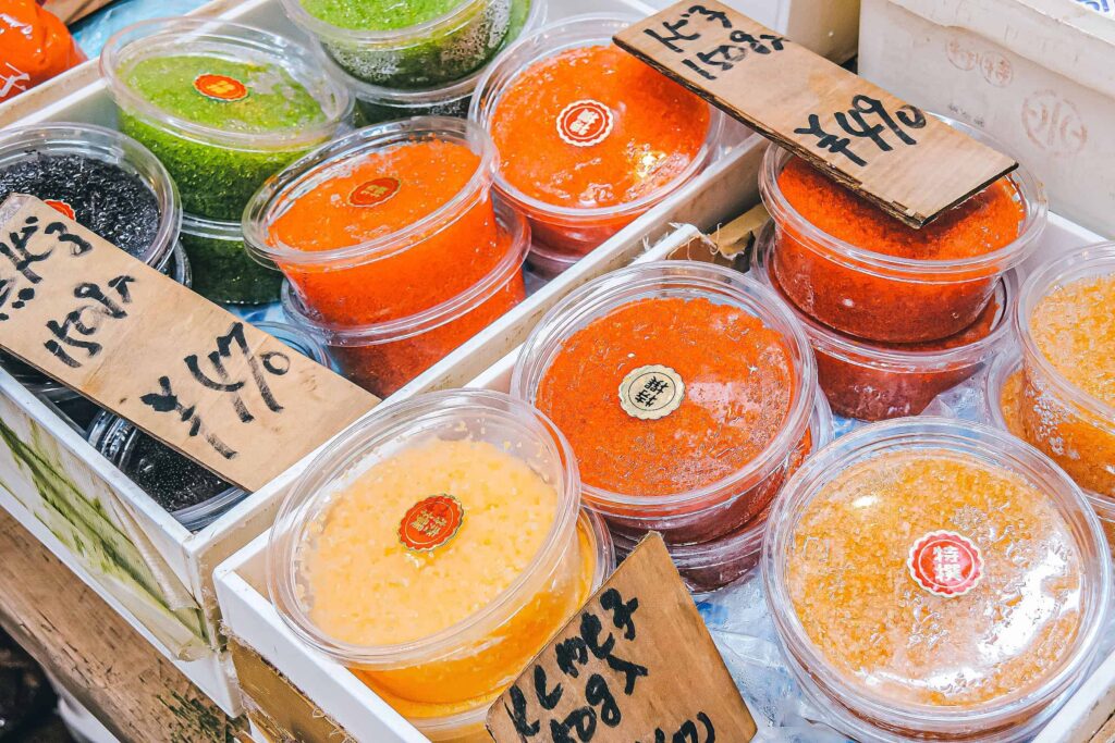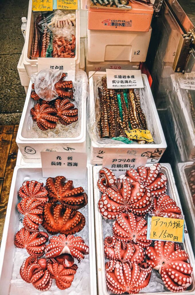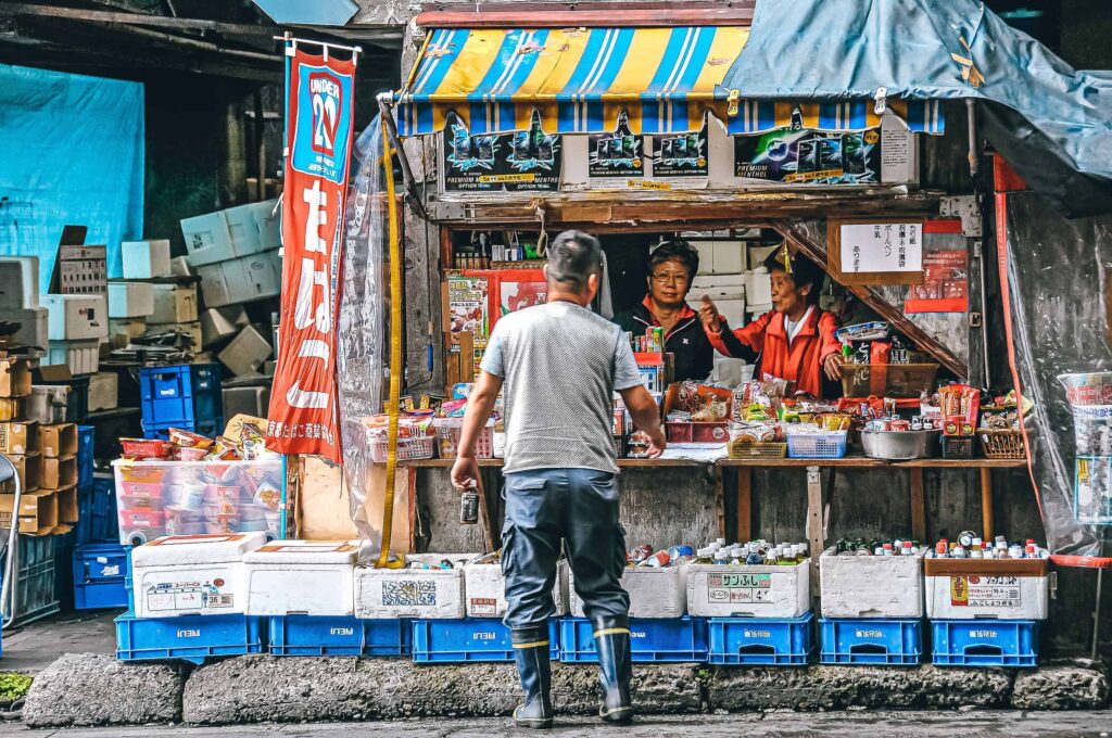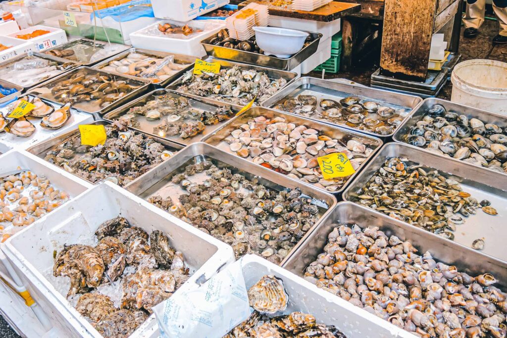Na przyległym bazarze można zjeść sushi lub coś mniej surowego. W zależności od efektu jaki wywołają zapachy i widoki targu Tsukiji.