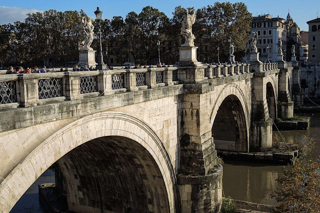 Do zamku doszliśmy szeroką aleją prowadzącą z Bazyliki św. Piotra, natomiast opuszczamy go od strony pięknego mostu. Most Świętego Anioła zdobią barokowe posągi aniołów autorstwa Berniniego oraz rzeźby św. Piotra i św. Pawła.