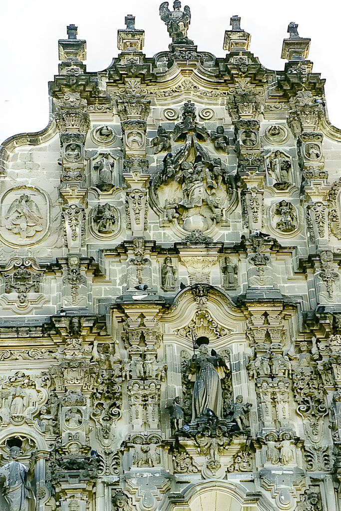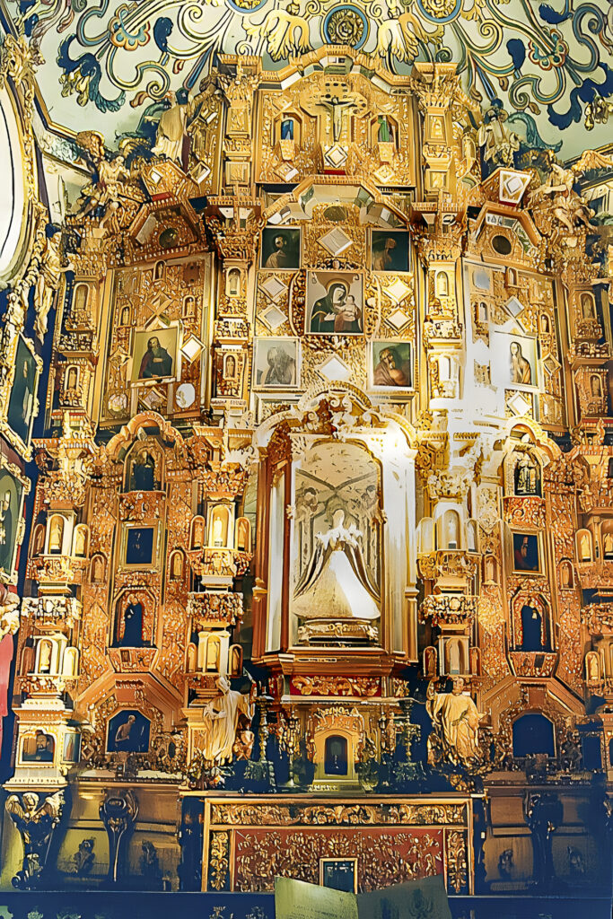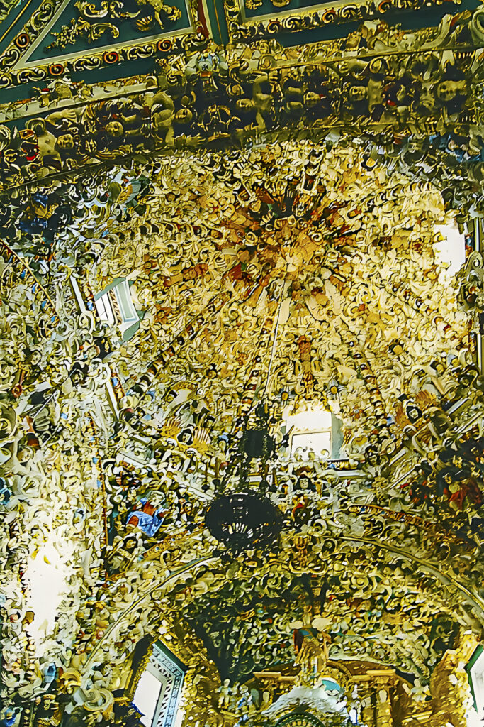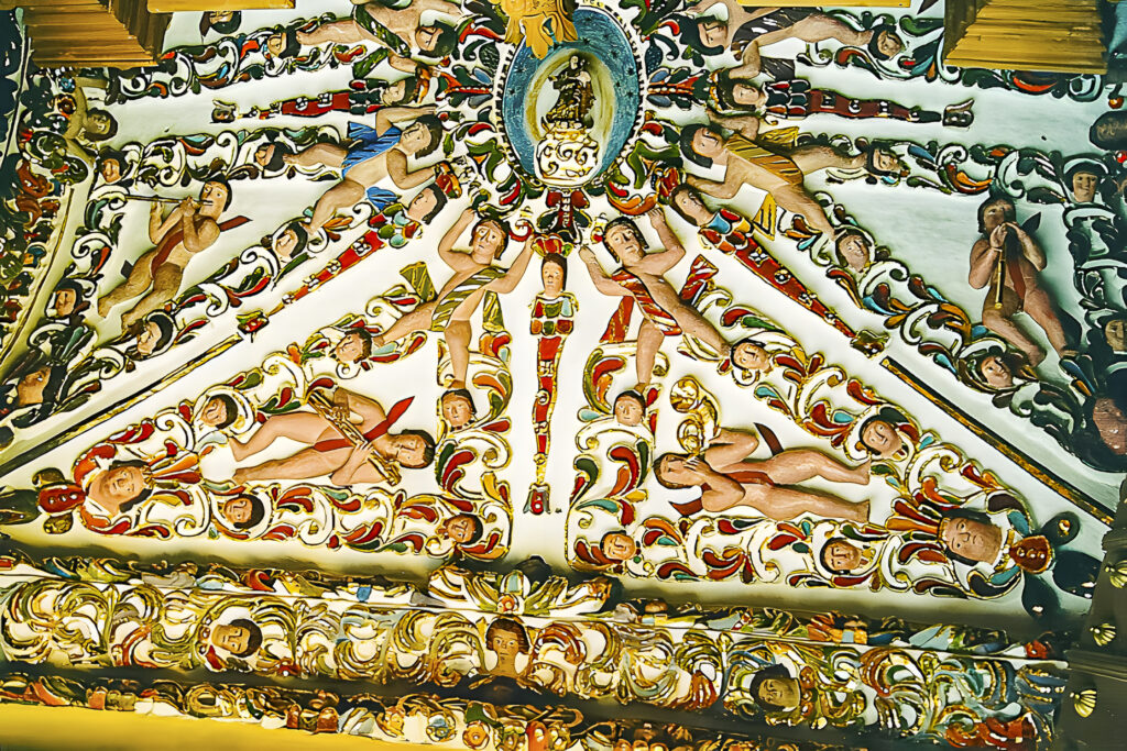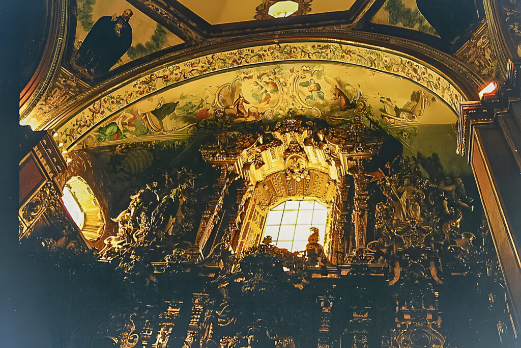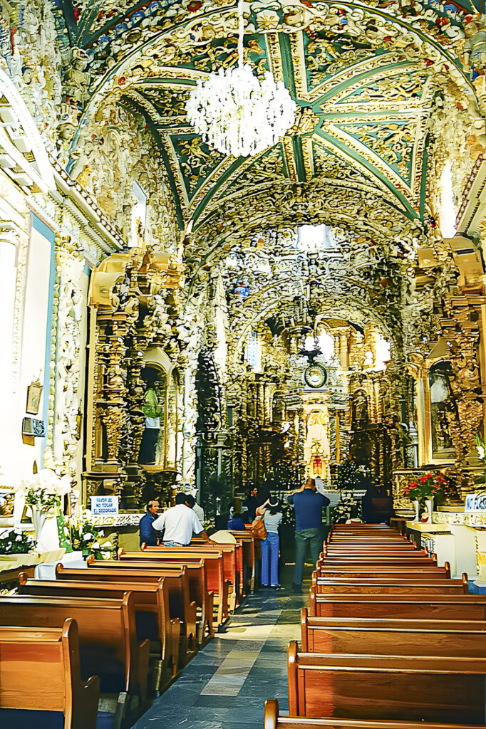 W środku… cóż, tam dopiero się dzieje! Feeria barw, milion detali – oszałamiające. Religijne postaci mają indiańskie rysy, aniołki noszą pióropusze… wszystko jakby z innego świata, a jednocześnie bardzo ludzkie i bliskie. Całość jest typowym przykładem churrigueryzmu – stylu barokowego, który przesadza z dekoracjami: złocenia, rzeźbione detale i ornamenty „atakują” oczy, tworząc efekt oszałamiającego przepychu. Czasem musieliśmy po prostu przystanąć i złapać oddech, bo oczy nie nadążały za detalami.