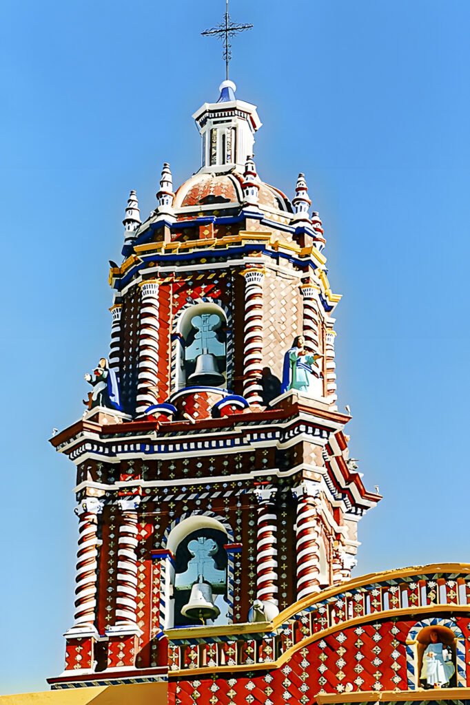 Santa María de Tonantzintla to maleńki kościółek, który odwiedziliśmy w drodze do Puebli. Budowę rozpoczęto w XVI wieku, a ostatnie rzeźby powstawały jeszcze w XX wieku. Fasada w żywej czerwieni z żółtymi i białymi akcentami wygląda jakby sama tańczyła w słońcu – naprawdę trudno oderwać wzrok.